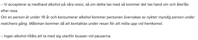 QPR Vinhandlarn Att ingen under 18 ej får dricka på resan det är helt ok men att de som är myndiga inte får ta ett par kalla. Det är inget annat en att förklara dem omyndiga. Jävla Nordkorea fasoner! Förstår att vanligt folk nobbar de där bussarna och tar bilen I stället. Det är väl bara de frireligösa som åker buss nu?