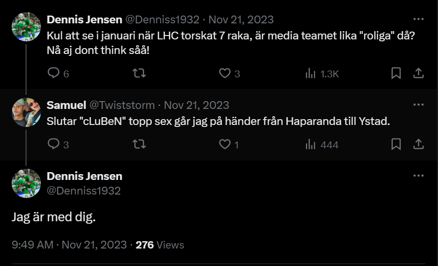 Heleuuuka Är det någon som har kvar den där tweeten när man drog någon syrlig passning till vårt mediagäng om att man skulle få äta upp det där i januari? Förövrigt, forza modo och växjö!