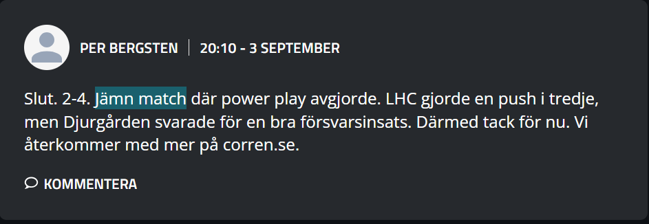 Tycker inte resultatet speglar min matchbild. Tycker vi var det absolut bättre laget 5 mot 5, aporna fick inte mycket gjort och vi spelade in oss väl i offensiv zon, men hade svårt att komma till vettiga avslut.