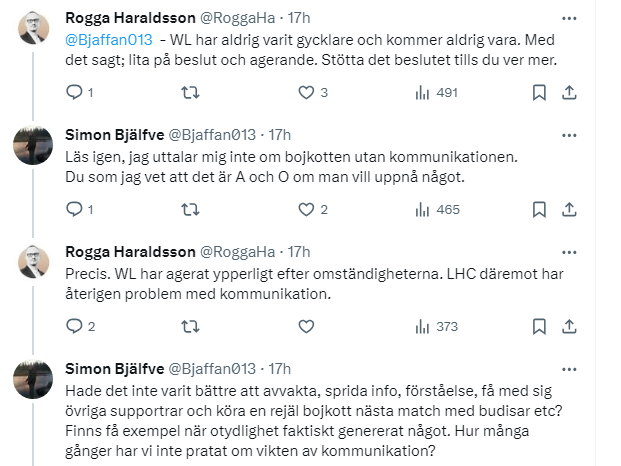 Det ironiska i detta är att WL klagar på dålig kommunikation, och så protesteras det på matchen igår med väldigt bristfällig kommunikation från eget håll. Det blev en hel del snack på sittplats igår där jag satt, och även nu här inne, om eventuellt felaktiga saker som sprids och blir till ”sanningar”. Håller med om att det tydligt borde framgått innan matchen, både till spelare och publik om att det skulle utföras en tyst protest, och anledningen till den.