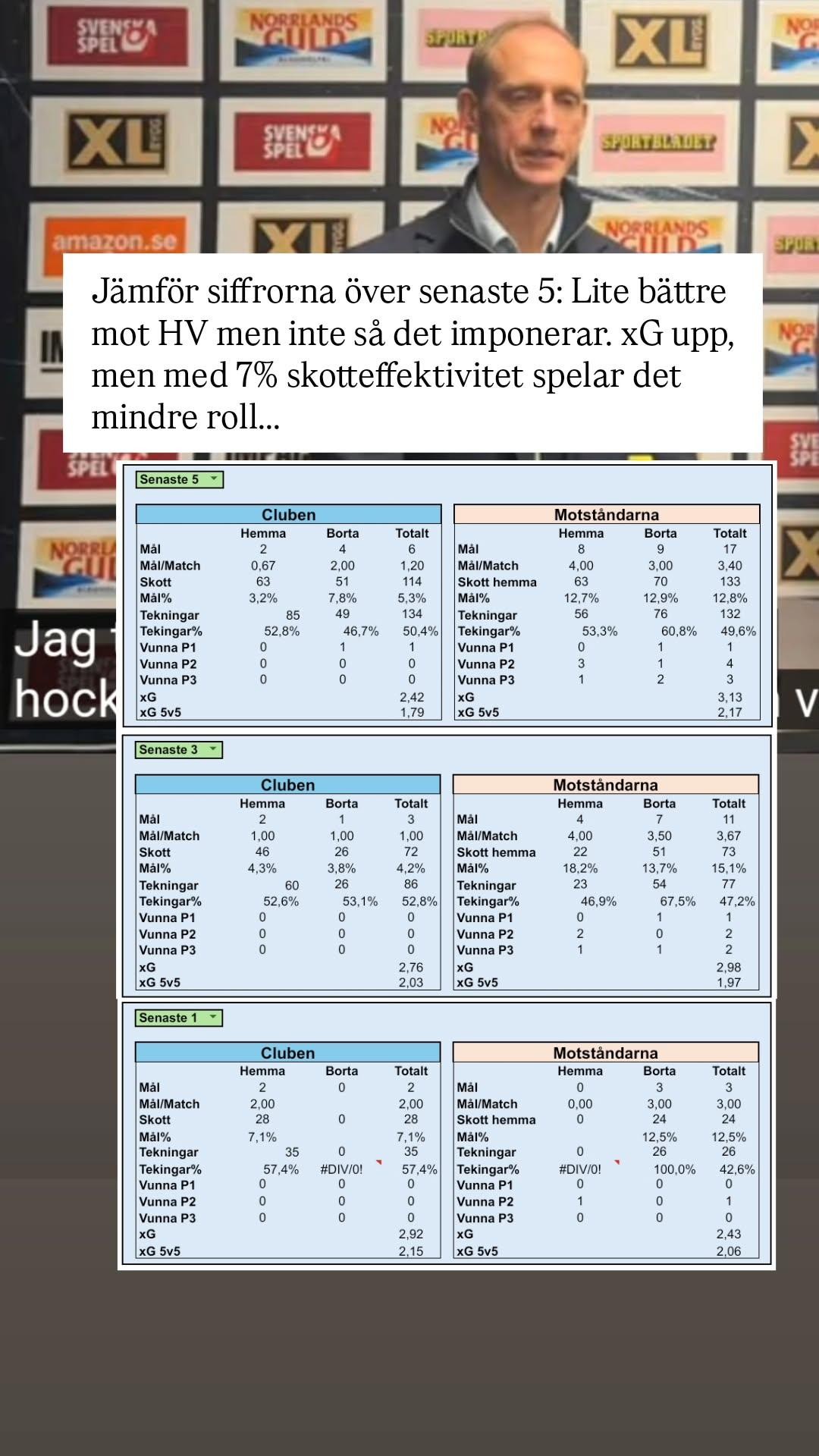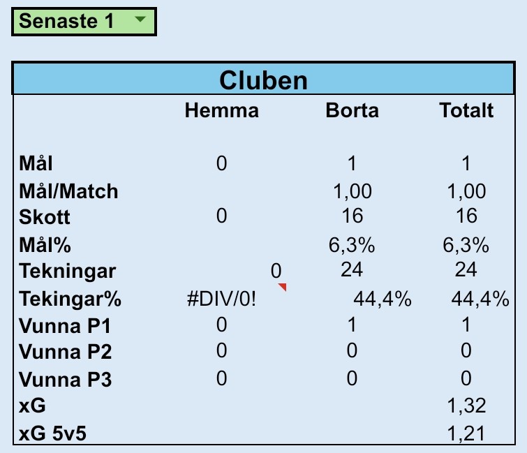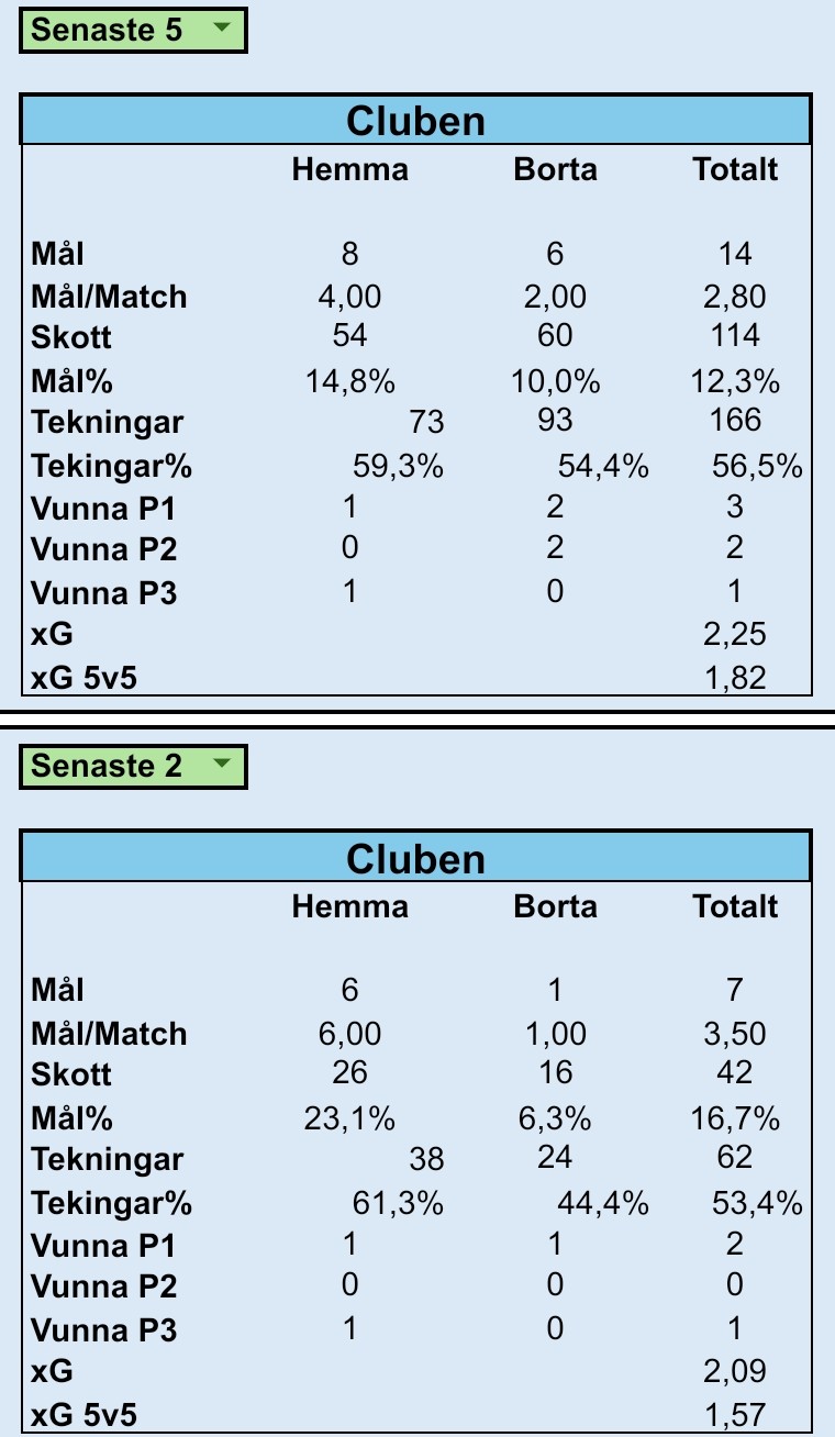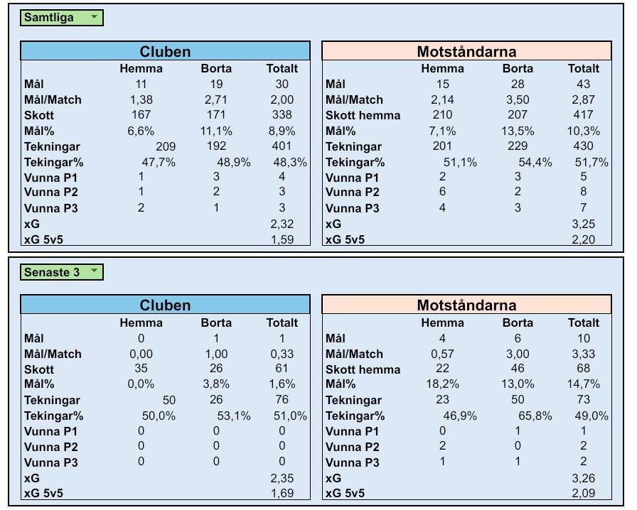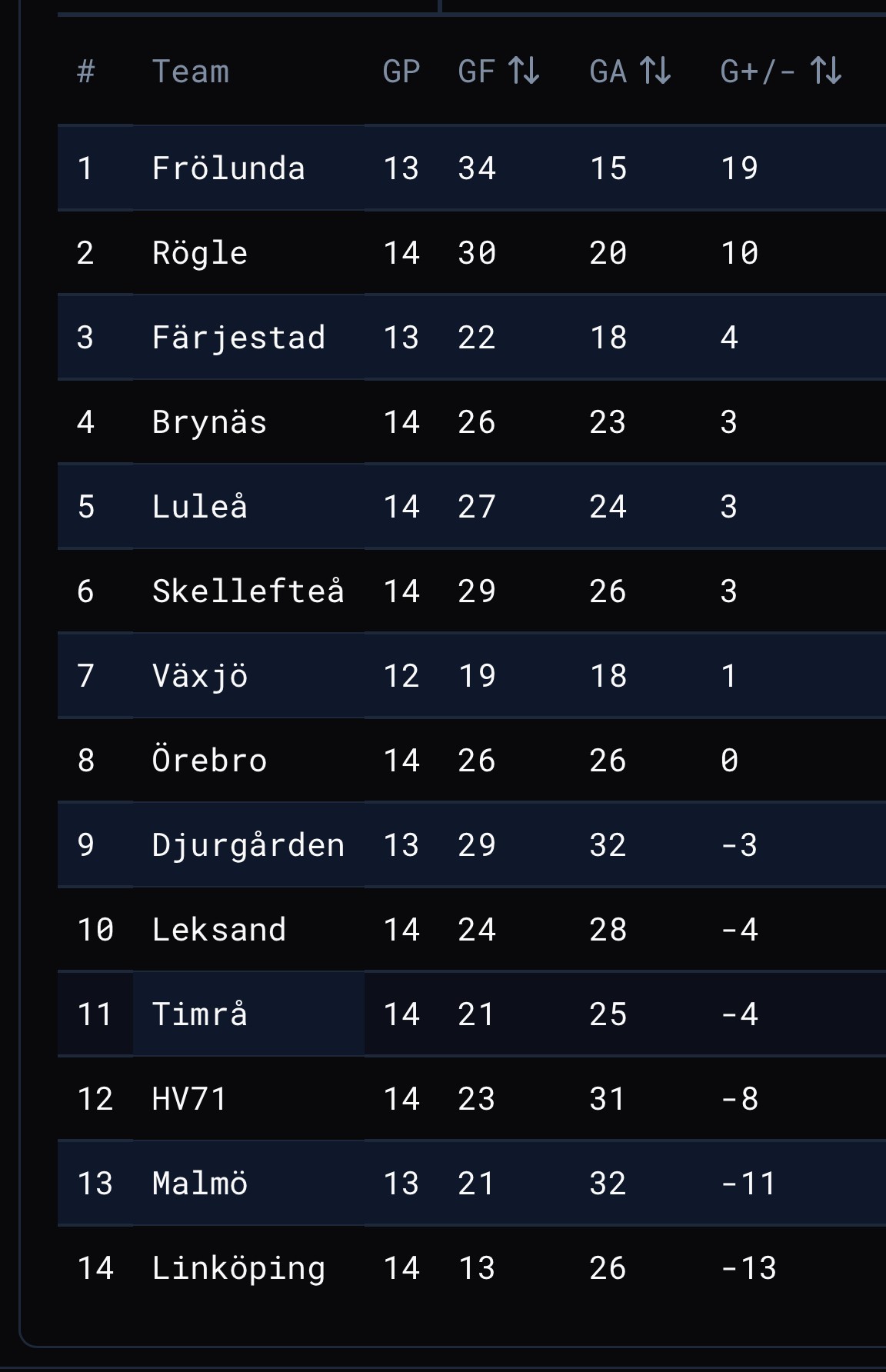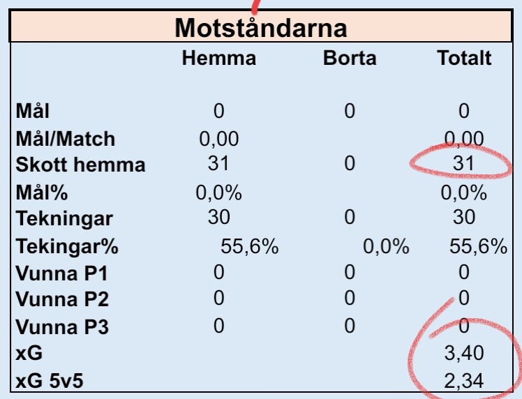 Mittzon Vi har -8,11 i goals above expected, överlägset flest (under förväntade menar jag), dubbla antalet mot tvåan i den ‘tabellen’ som är Brynäs på -4,66, följt av Färjestad på -2. Så vi har xG på 21 mål framåt i lika styrka (11:a) men har gjort 13 stycken… Alltså från Hockeysiffror.